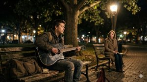 I noticed her because she didn’t do what most people did. She didn’t slow down for a verse and keep walking. She didn’t clap politely or toss change without looking. She stopped. Sat on a bench across from me. And listened.