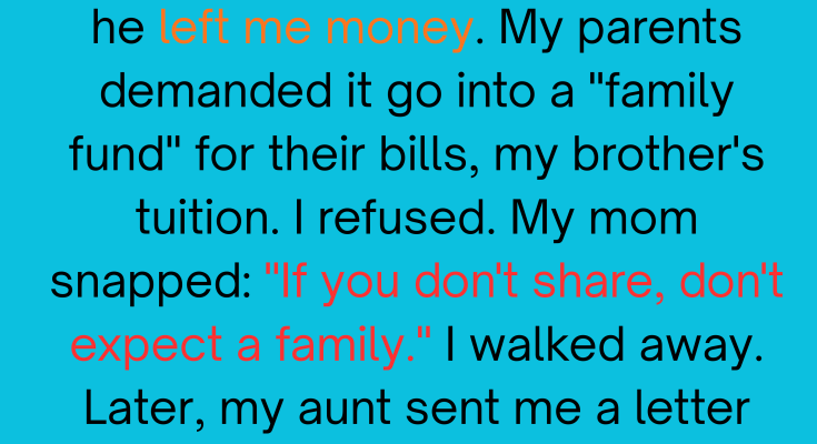 When my grandfather passed away, he left me a substantial inheritance. It wasn’t just money—it was a symbol of trust, of love, of everything he believed I could build. But my parents didn’t see it that way.