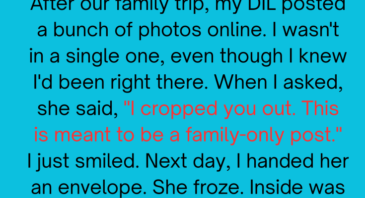 Since then, things have shifted. She’s more careful. More polite. I don’t know if it’s genuine—but I do know she won’t crop me out again.