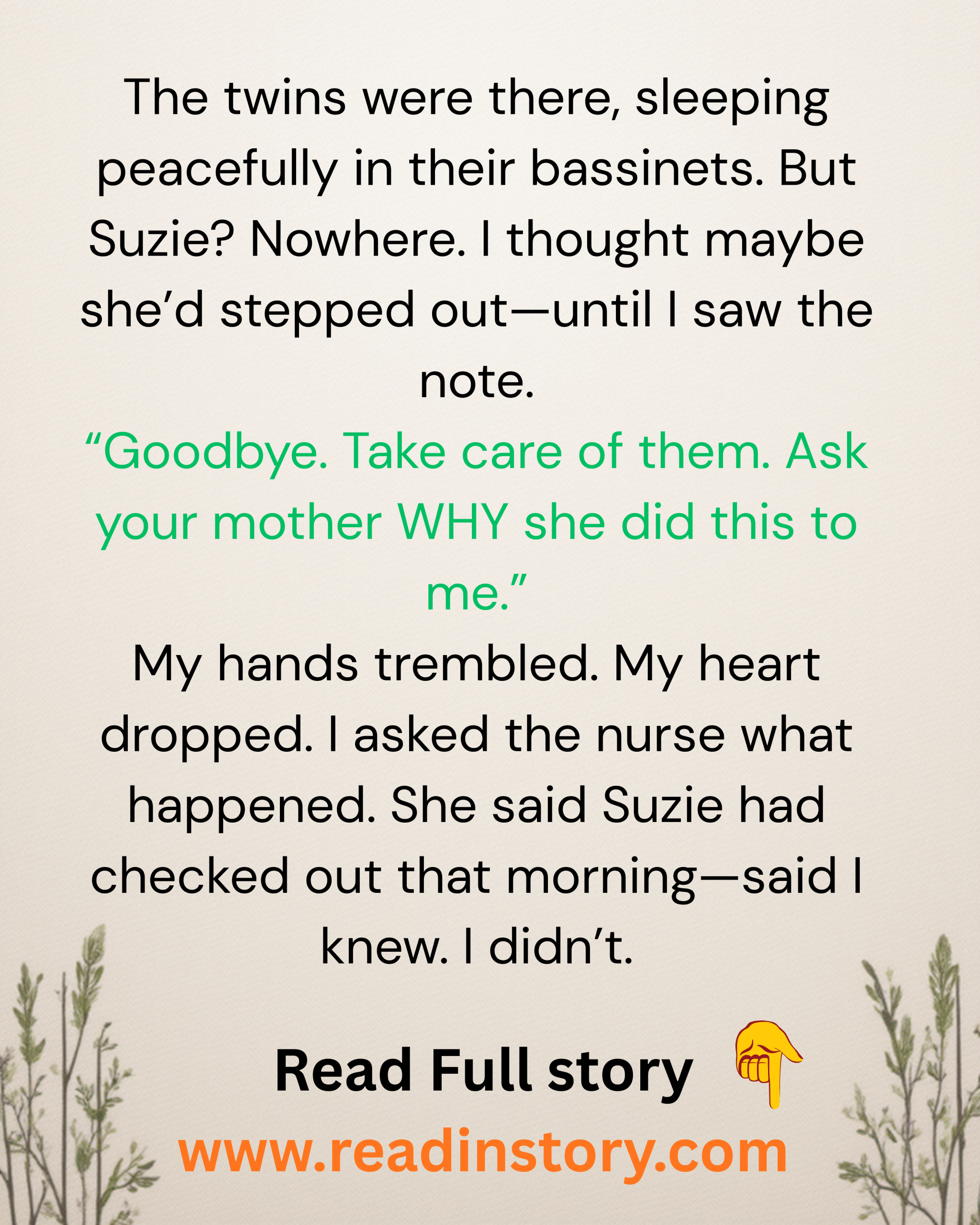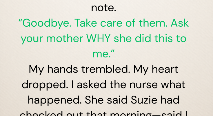 The twins were there, sleeping peacefully in their bassinets. But Suzie? Nowhere. I thought maybe she’d stepped out—until I saw the note.