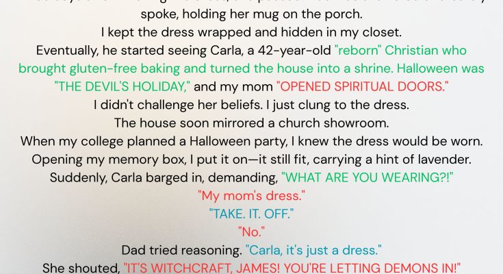 From downstairs I heard Dad’s voice: “Everything okay up there?” Carla didn’t answer. She stormed halfway down the hall, turned to me, eyes blazing. “You’re opening spiritual doors you don’t understand. That dress is part of the darkness your mother brought into this house.”