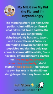 Diane’s face paled. She slammed her purse shut and stormed out, declaring she’d never be treated like a stranger in her own daughter-in-law’s home. Jason tried to smooth things over, but I held firm. Noah’s health came first, and I wasn’t willing to risk another night of high fevers or flu complications for the sake of polite family drama.