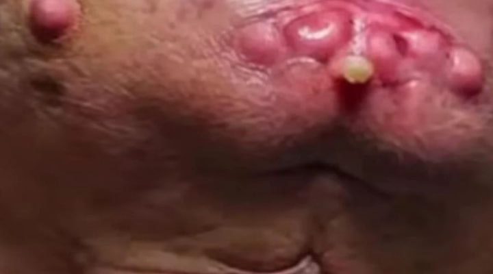 Clusters of lesions, often on the chin, jawline, or cheeks